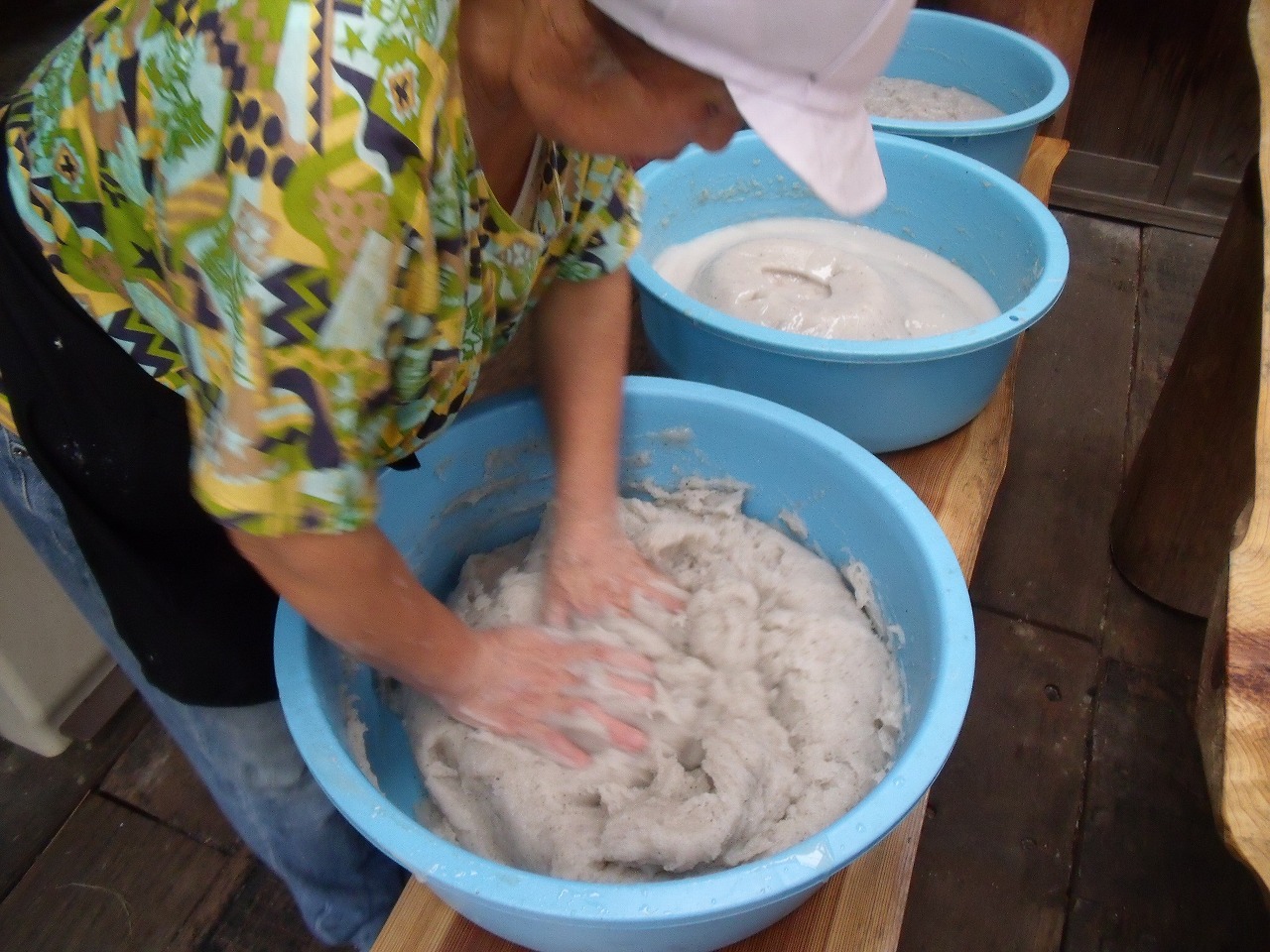 水見色のお母さんがこねている桶の奥、3つ並んでいる真ん中の桶はミキサーでペースト状にしたものです。